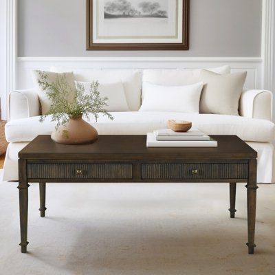 Enhance your living space with the timeless elegance of Martha Stewart’s Lily Pond collection. The dark brown wood veneer coffee table combines classic design with practicality. Two drawers on one side offer convenient storage, while fluted faces add a touch of texture. The antique brass metal knobs exude sophistication, while the tapered square turned legs add a touch of grace. This coffee table is a perfect addition to any home. Assembly required. Wipe clean with a damp cloth. Martha Stewart