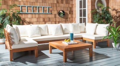 Create a backyard oasis with this stylish outdoor living set. Made using Eucalyptus wood and includes a sectional sofa in beige upholstery and throw pillows. A matching coffee table is ideal for entertaining. Safavieh