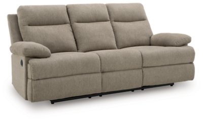 Fully upright or completely stretched out, this traditional-inspired reclining sofa caters to the art of relaxation. Super soft mocha-colored upholstery and sumptuous cushioning-made all the more indulgent with pillow top arms-cradles you in comfort from head to toe. A middle seat with a drop-down table, cup holders and USB charging takes comfort and convenience to another level. Signature Design by Ashley® is a Registered Trademark of Ashley Furniture Industries, LLC.
