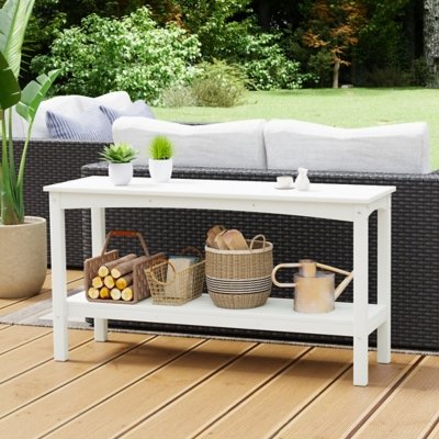 This 2-tier console table is made of HDPE material with reinforced legs, making it sturdy and durable. The eye-catching piece is perfect for dressing up any entryway, displaying your favorite decorations and drinks out by the patio, or being the perfect piece to hold your hand towels and other toiletries. The display function and storage capacity of this console table with shelves satisfy your wants and wishes for either outdoor or indoor use.